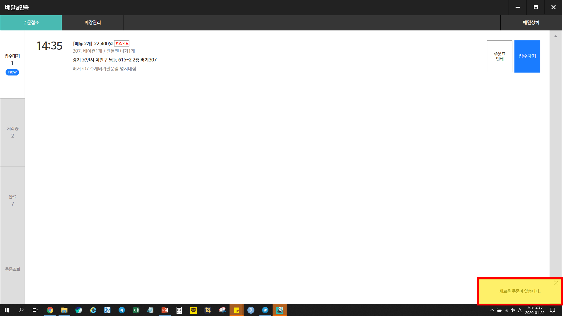 배달의민족 주문이 들어오면 우측하단에 "새로운 주문이 있습니다." 문구가 뜨는데요.