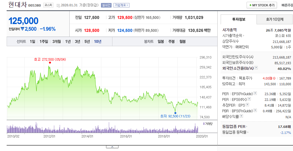 앞서 언급드렸듯이 현대자동차는 지난 7년간 영업이익이 적자는 아니었지만 꾸준히 감소해왔습니다. 자동차 대장주의 주가가 지지부진한 요인이 가장 크다고 판단이 됩니다.