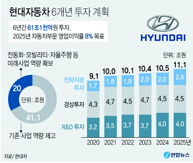 현대차는 2025 전략을 달성하기 위해 2020년부터 2025년까지 6년간 약 61조원을 투자하는데, 이 중 20조원이 전기차, 모빌리티, 자율주행, AI, 로보틱스, PAV(개인형 무인항공기) 등을 개발하는데 편성되어 있습니다.