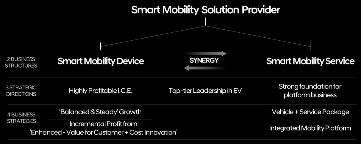 스마트 모빌리티 솔루션 기업으로 발걸음 하기 위해 스마트 모빌리티 제품과 스마트 모빌리티 서비스란 두 가지 사업구조를 통해 글로벌 시장에서 경쟁력을 강화하는 방향의 목표를 설정했습니다.