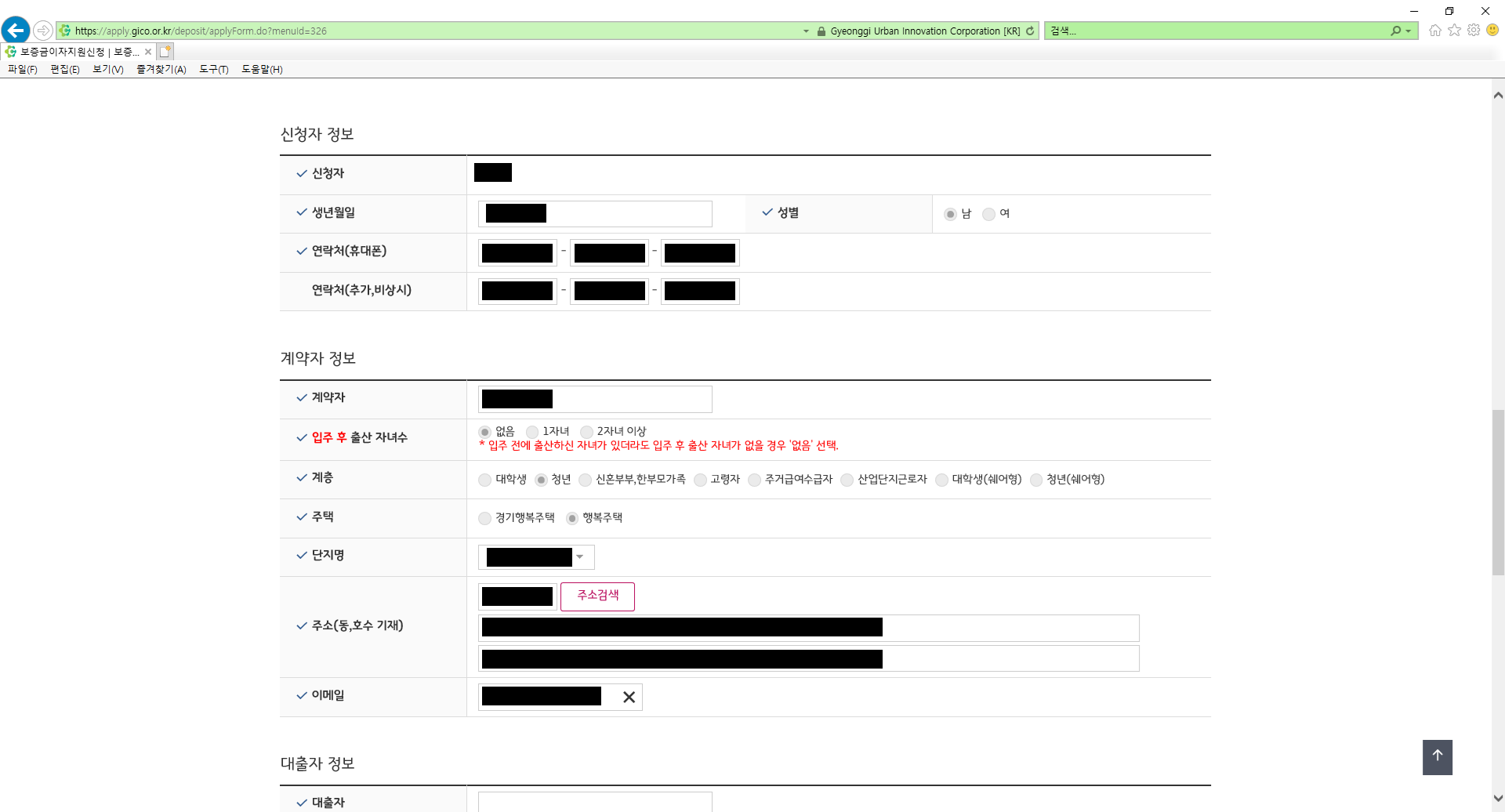다음으로 신청자 정보, 계약자 정보, 대출자 정보 각 항목에 대해 입력해주도록 합니다.