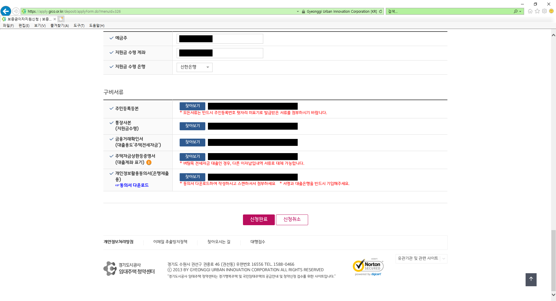 마지막으로 구비서류 5가지를 첨부해주고 신청완료 버튼을 클릭합니다.