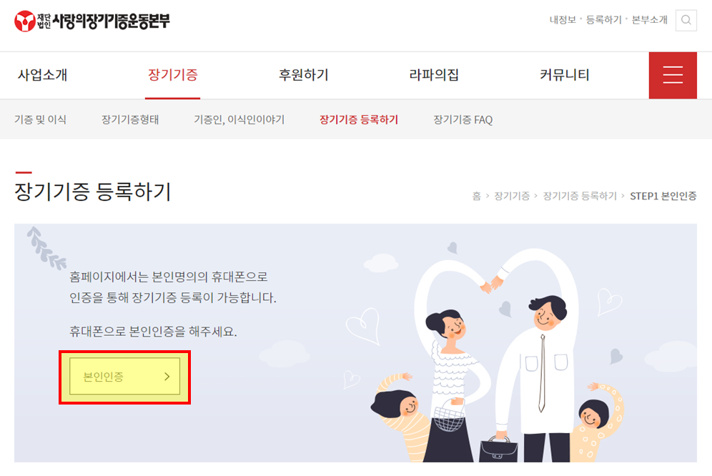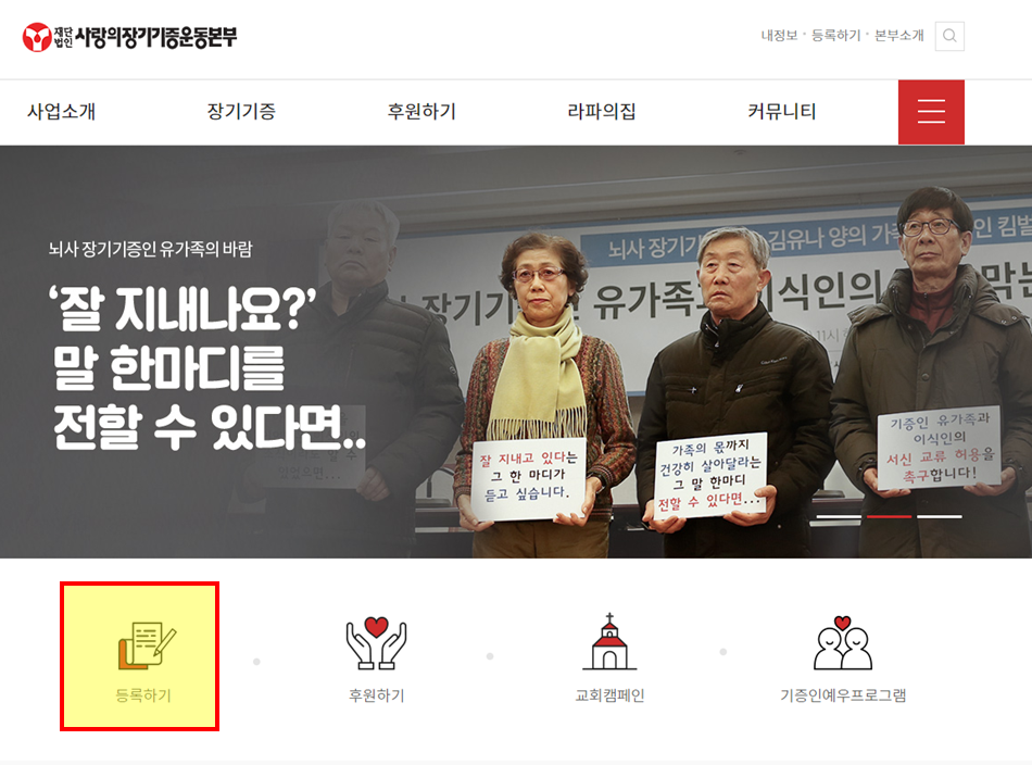 사랑의장기기증운동본부(https://www.donor.or.kr/home/index.asp)에 접속하여 "등록하기"