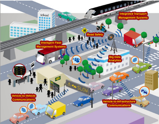 지능형교통체계(ITS), 도로안전, 빅데이터 분석, V2V, V2X 등이 융합된 미래 모습입니다.