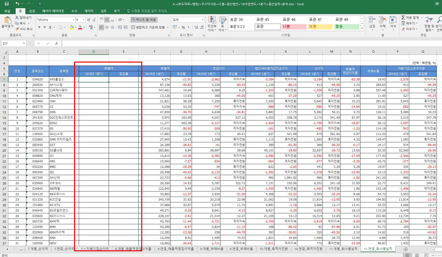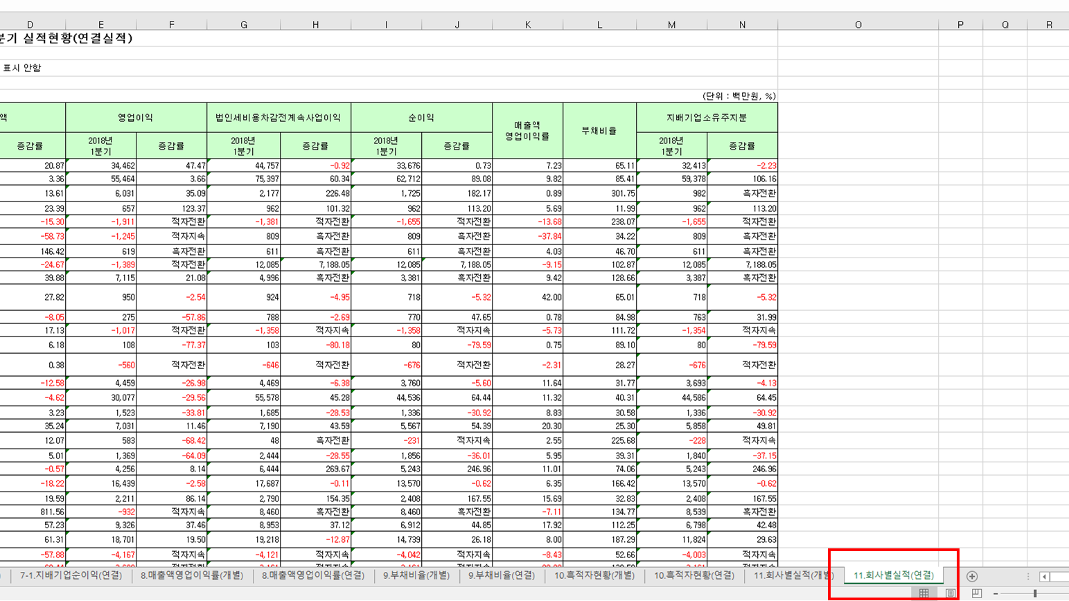 전년동기 자료를 추가로 다운 받으셨다면 열어주시고, 동일하게 "11.회사별실적(연결)" 시트로 이동해줍니다. 어라? 시트명이 살짝 다르네요. 기업의 정렬 순서도 살짝 다르고요. 그러나 우리는 할 수 있다!!!
