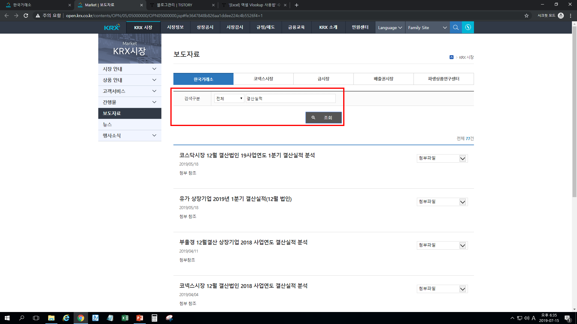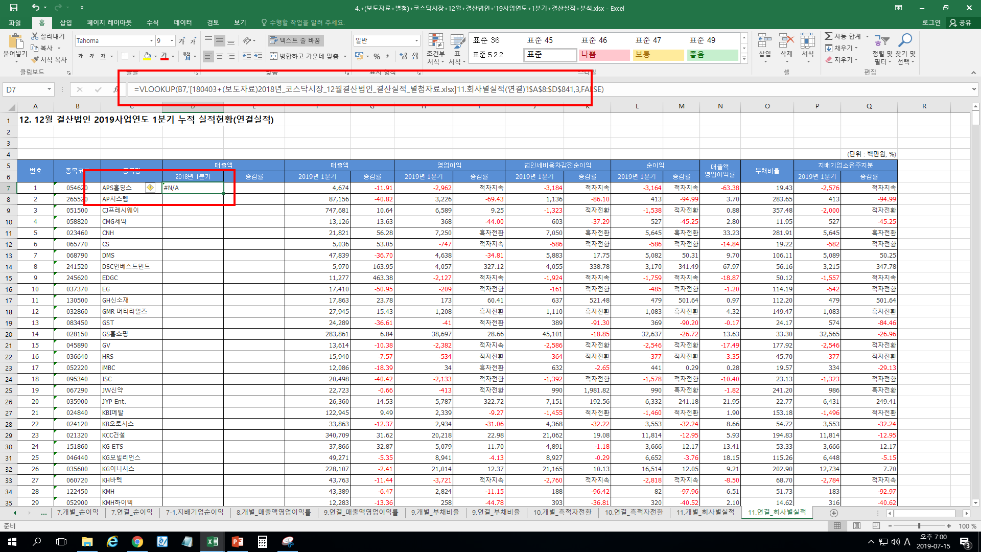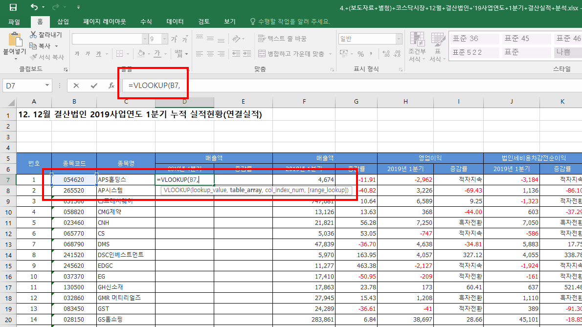 이와 관련된 분석을 용이하게 하기 위해 전년동기(2018년 1분기 결산실적 자료를 다운로드)와 비교해보고 싶을 바로 엑셀의 vlookup이라는 함수를 활용하면 수월합니다.