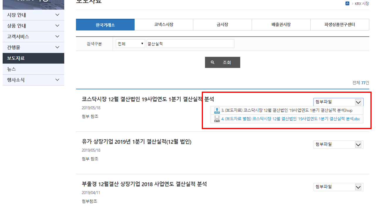 보도자료의 검색기능을 통해 "결산실적"이란 키워드로 검색합니다.