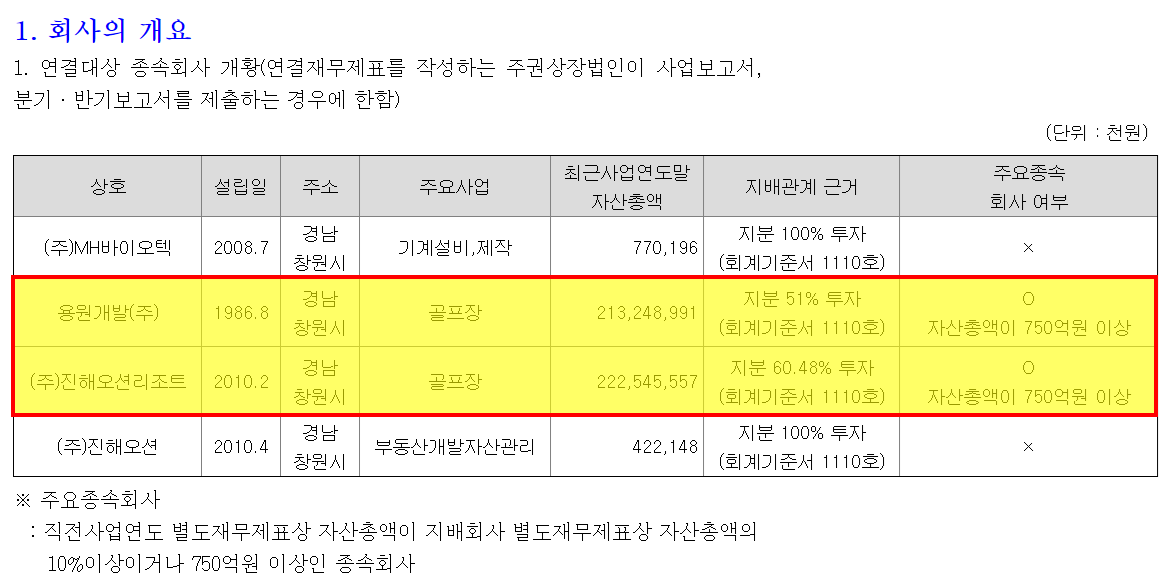 용원CC와 진해오션의 아라미르CC 골프장 지분을 갖고 있네요.