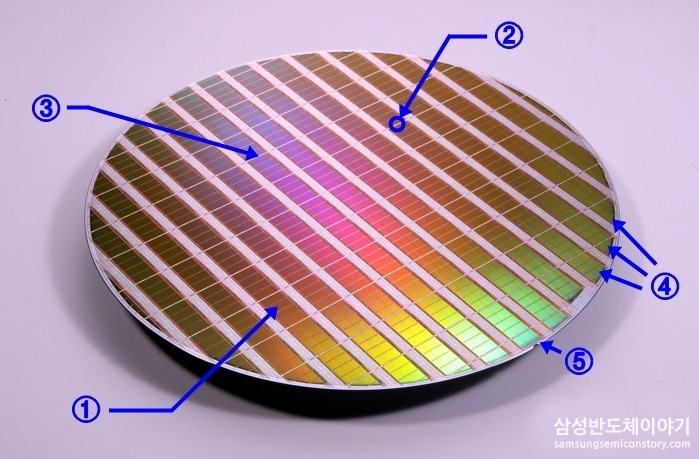 1단계_웨이퍼 제조 : 웨이퍼는 반도체 집적회로를 만드는데 사용하는 주재료이며 실리콘(규소, Si), 갈륨아세나이드(GaAs) 등을 성장시켜 얻은 얇은 원판입니다.