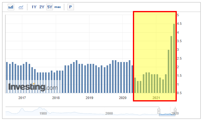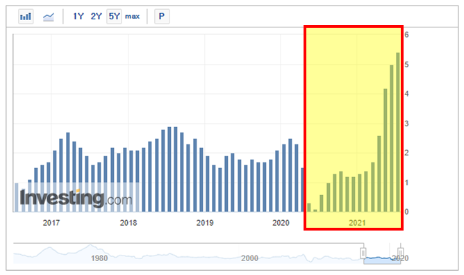 최근 5년간의 추이를 보면 소비자물가지수와 마찬가지로 코로나19 이후 특히 올해들어 가파르게 상승추세임을 알 수 있습니다.