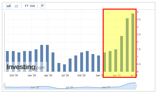 미국의 물가 상승이 빠른 속도로 진행되고 있다 볼 수 있겠습니다.