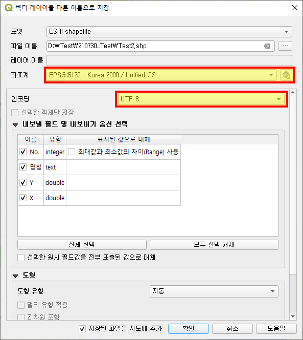 확인이 끝났으면 [내보내기 - 객체를 다른 이름으로 저장]을 통해 shp 파일로 변환시킵니다.