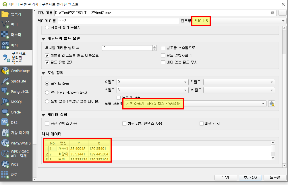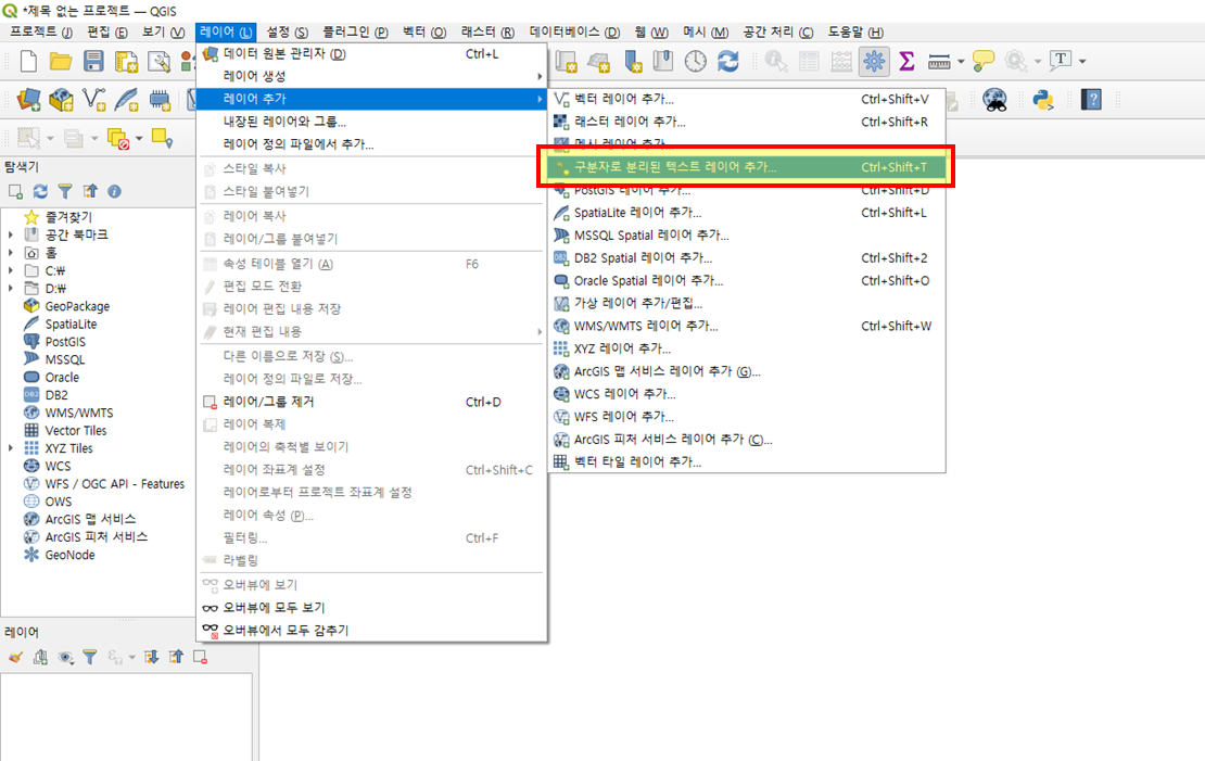QGIS에서 레이어(L) - 레이어 추가 - 구분자로 분리된 텍스트 레이어 추가(Ctrl+Shift+T)