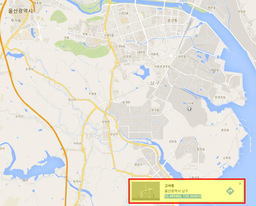 구글지도에서 포인트를 찍으면 하단에 (경도, 위도) 형태로 표시가 됩니다.