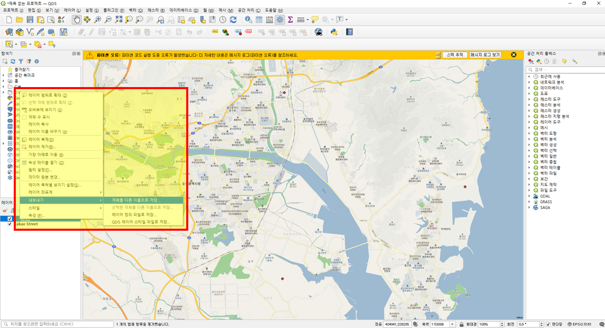 확인이 끝났으면 [내보내기 - 객체를 다른 이름으로 저장]을 통해 shp 파일로 변환시킵니다.