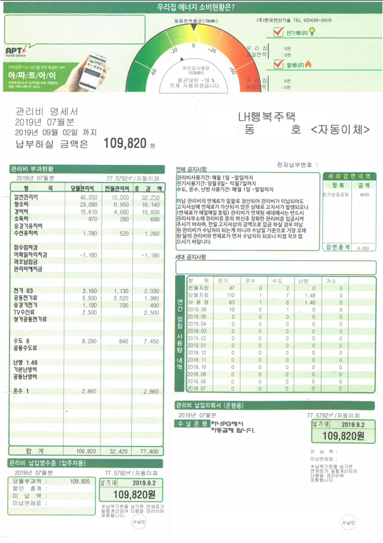 외박 없이 거주한 한 달(2019.07)의 실제 관리비 고지서 내역을 공개하겠습니다.