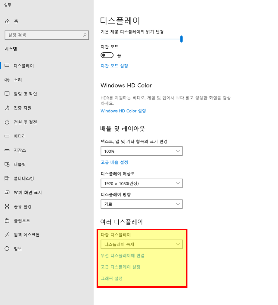 그리고 [바탕화면 - 마우스 우클릭 - 디스플레이 설정]에서 다중 디스플레이를 "디스플레이 복제"로 변경합니다.