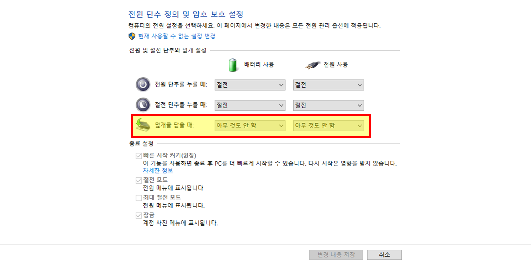 덮개를 닫을 때 상태를 "아무 것도 안 함"으로 변경해줍니다.