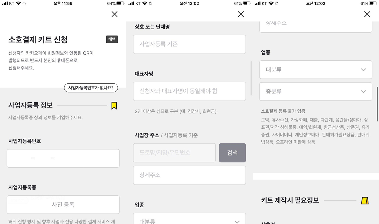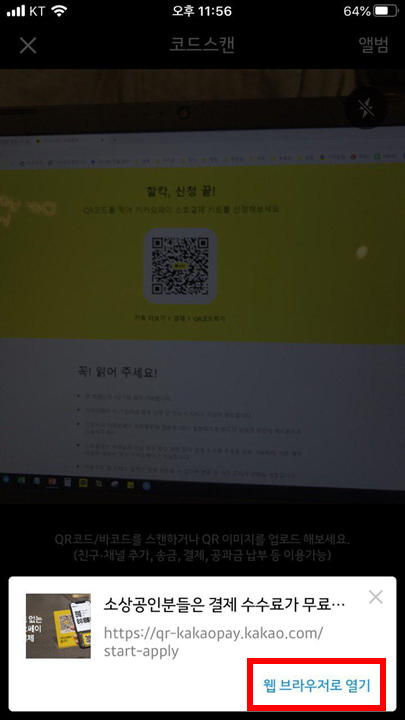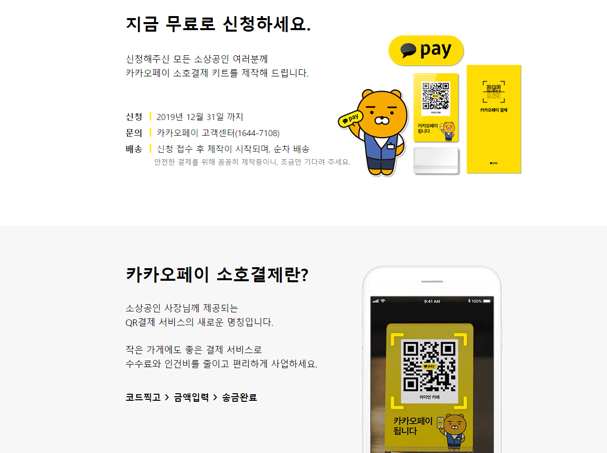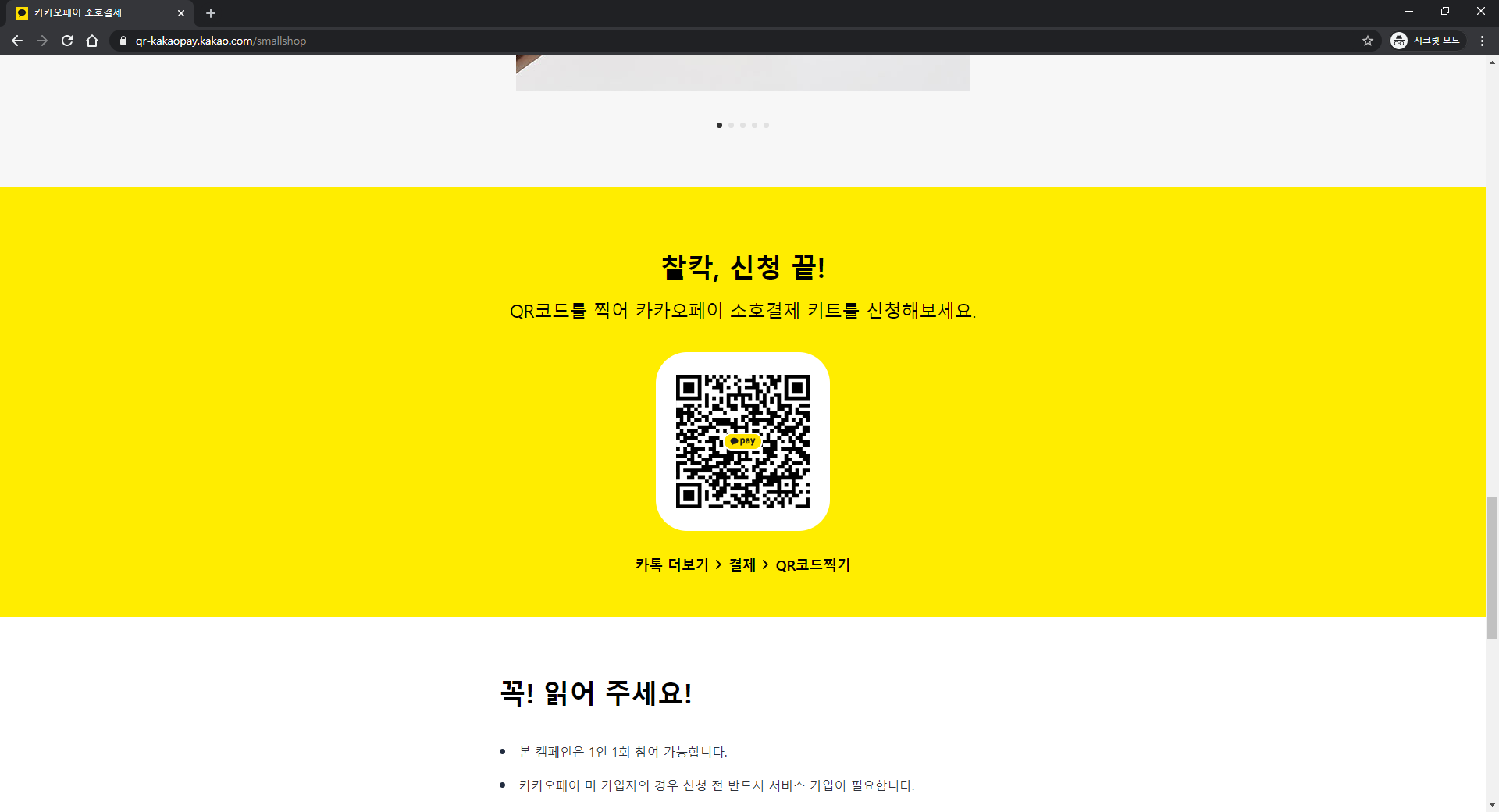 신청은 카카오페이 소호결제(https://qr-kakaopay.kakao.com/smallshop)에서 하실 수 있습니다.