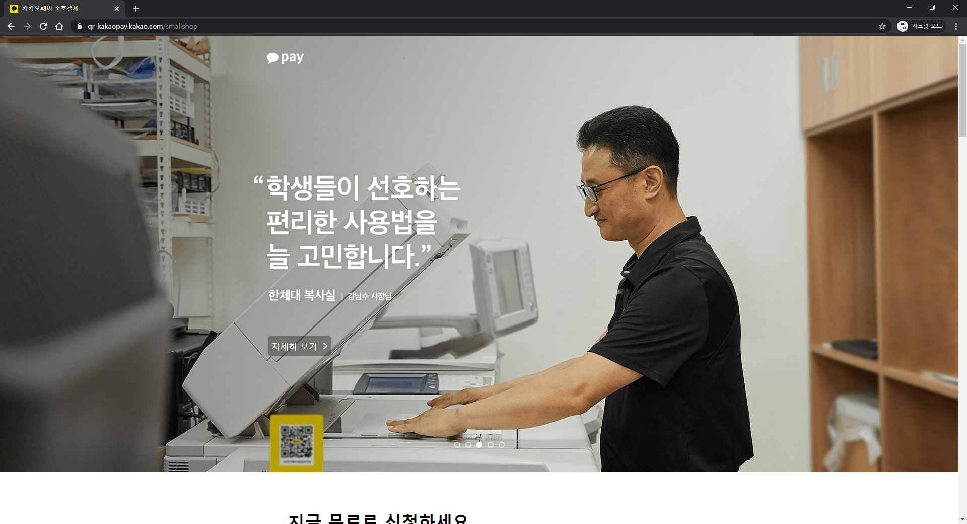 카카오페이 소호결제(https://qr-kakaopay.kakao.com/smallshop)에서 스크롤을 내리시면 아래와 같은 화면이 보입니다.