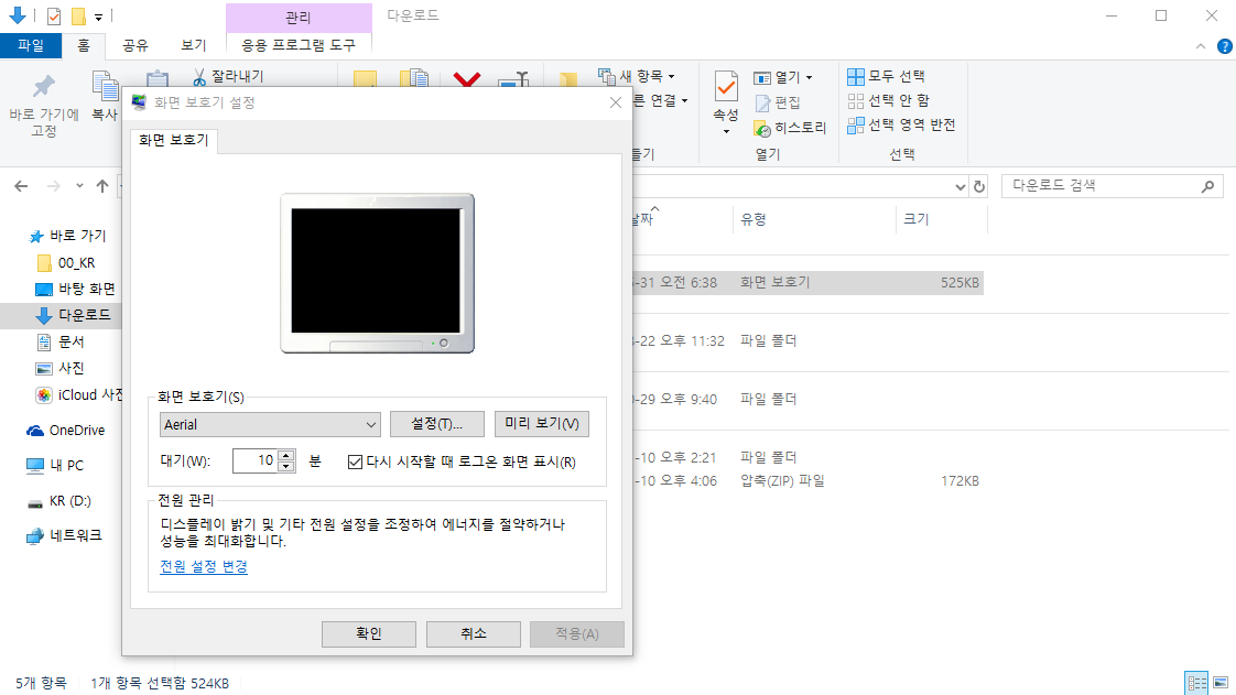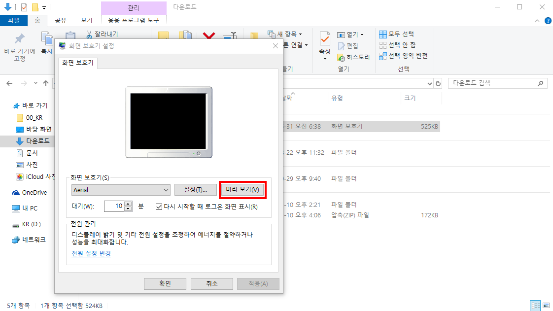 이것을 화면 보호기 창에서 적용하시면 됩니다.