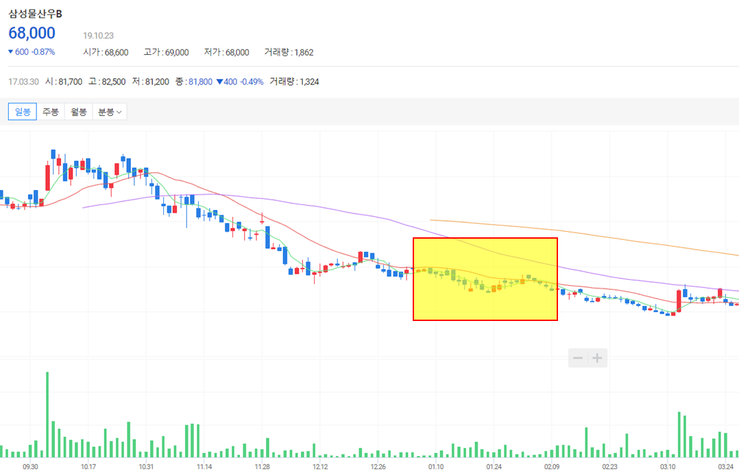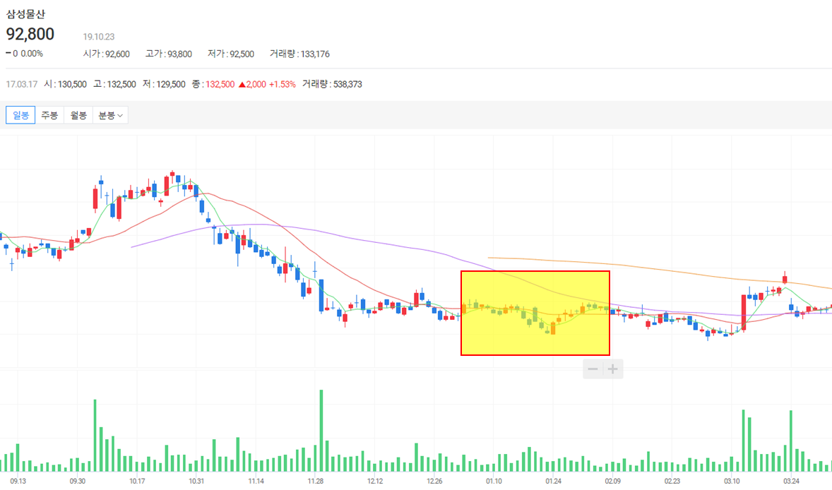 그렇다면 동일한 시기 삼성의 지주회사 삼성물산(028260)의 주가 행방은 어떠했을까요?