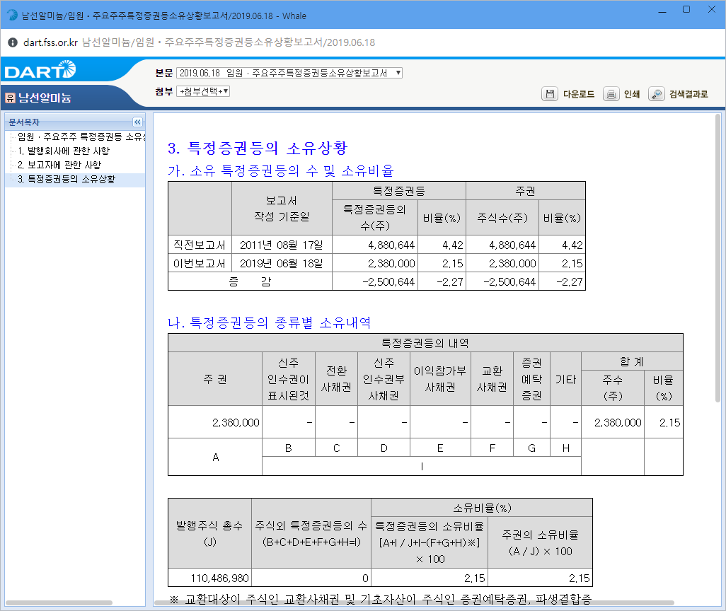 또한 지난 6월 남선알미늄을 지배하고 있는 SM그룹의 회장인 우오현 이사가 장내 지분을 매도했습니다.