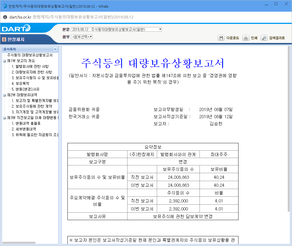 앞선 사례와 동일하게 지난 8월 12일 최대주주 김승한 회장의 지분이 40.24% → 4.01%로 대폭 감소했습니다.