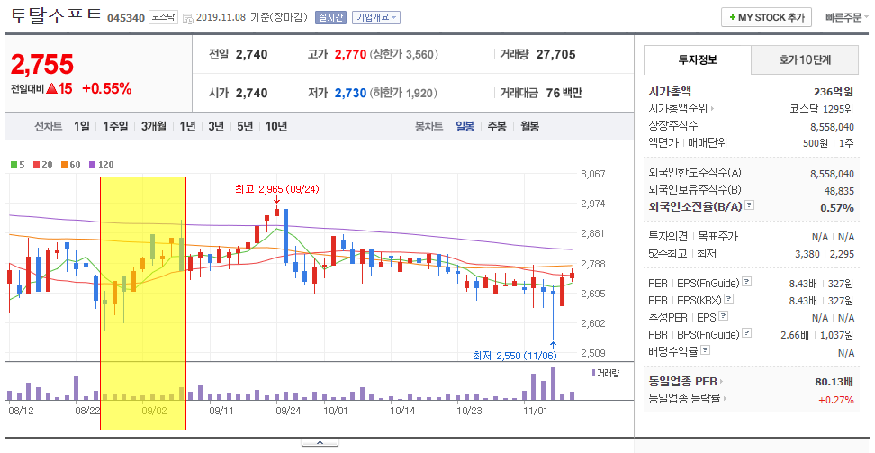 현재 주가는 2,755원으로 52주 최저/최고가의 중간 지점 부근에 있네요.
