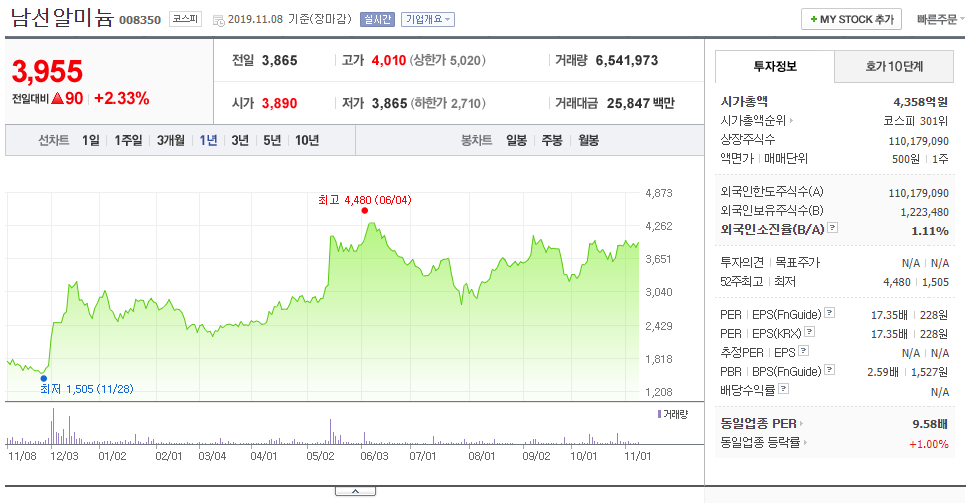 이낙연 총리의 대장주 역할을 하고 있는 남선알미늄의 최근 1년 주가추이를 보겠습니다.