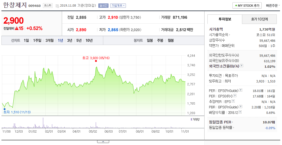 다음은 황교안 대표의 대장주인 한창제지를 보겠습니다.
