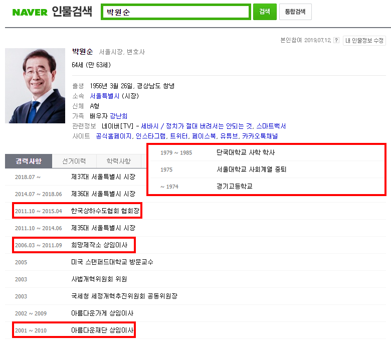 - 박원순 시장은 2001년부터 2010년까지 아름다운재단 상임이사로 활동